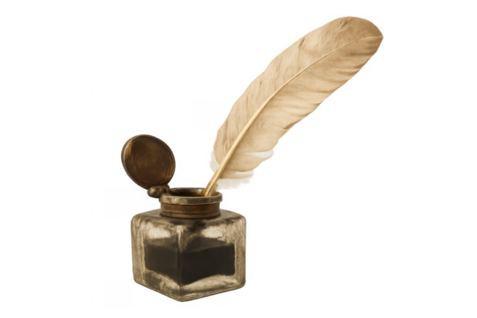 Feather pen dipping into inkwell on transparent background