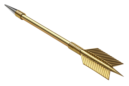 Shiny red arrow. Metallic details. Feathers and pointed end. Success concept