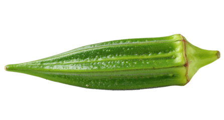 Close-up of a single okra pod.  Fresh green okra, smooth skin with slight ridges, pointed ends.  Dark background