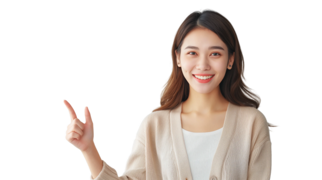 Cheerful young Asian woman in orange shirt pointing fingers at copy space isolated on transparent background