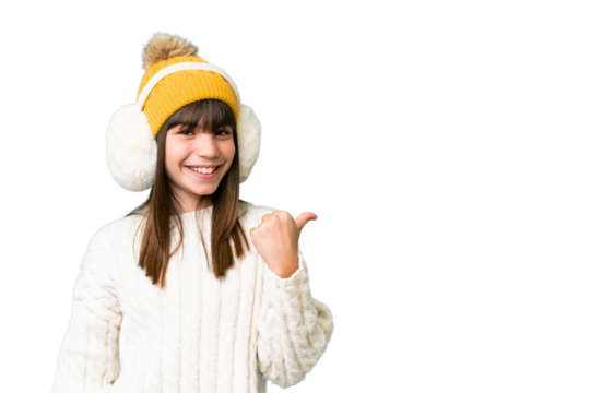 Little caucasian girl wearing winter muffs over isolated background pointing to the side to present a product