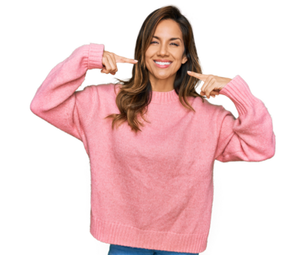 Young hispanic woman wearing casual clothes smiling cheerful showing and pointing with fingers teeth and mouth. dental health concept.