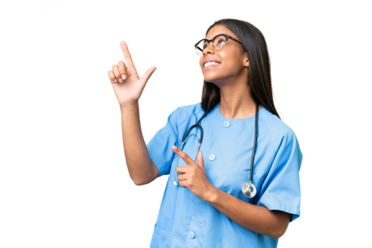 Young African american nurse woman over isolated background pointing with the index finger a great idea