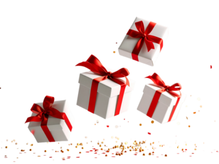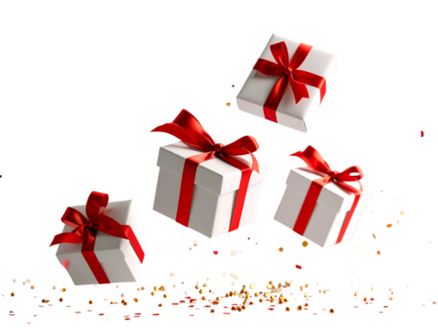Christmas gift boxes with red ribbons and festive confetti burst isolated on transparent background PNG