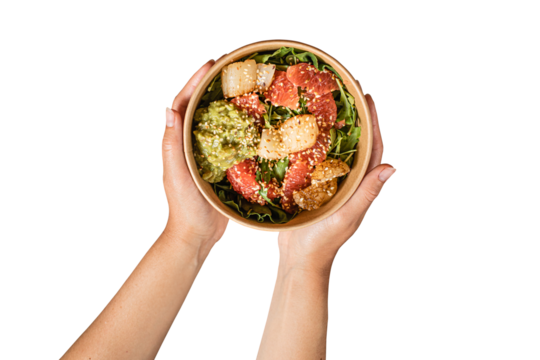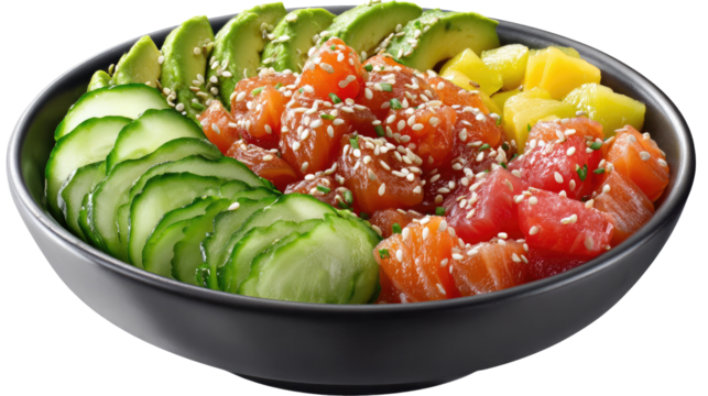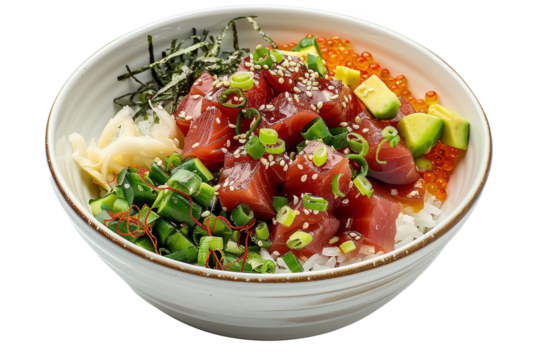 Fresh and Vibrant Poke Bowl on a transparent background – Healthy, Trendy Hawaiian Fusion Dish Perfect for Foodies, Clean Eating, and Balanced Nutrition Enthusiasts. Png cut out.
