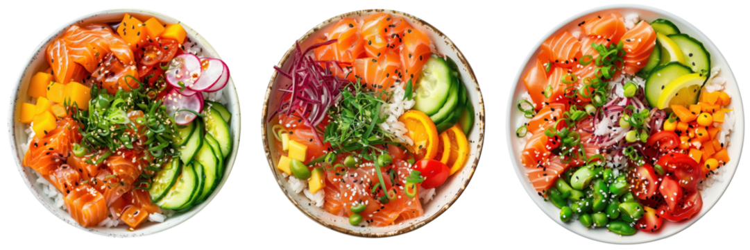 set of salmon poke bowl with fresh fish, rice, and colorful vegetables on a transparent background