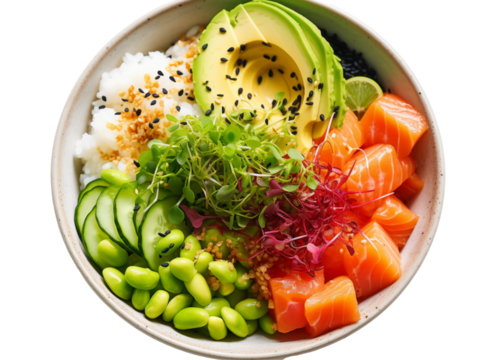 Fresh salmon poke bowl with edamame beans avocado rice and sesame seeds isolated on transparent background