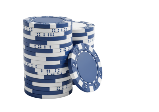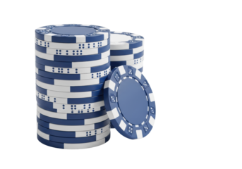 Macro studio photo of an isolated stack of deep blue and white clay poker chips with dice markings on a transparent background and ample right copy space. Concept of high-stakes gambling