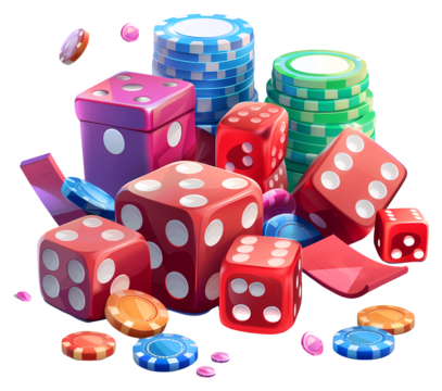 A collection of colorful casino poker chips, including blue, green, red, and yellow, isolated on a transparent background