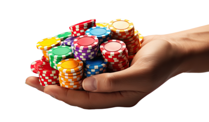 Hands holding poker chips isolated on transparent background - Generative AI