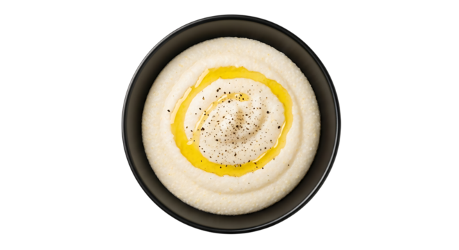 Creamy white polenta with a swirl of golden olive oil and cracked black pepper in a dark bowl, isolated on a transparent background, cutout, PNG