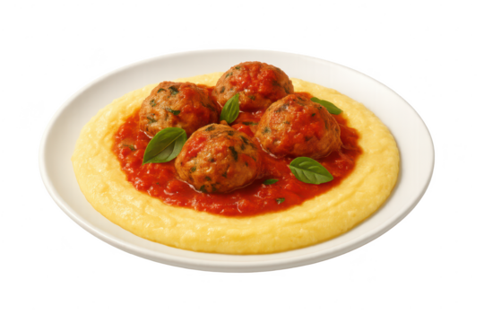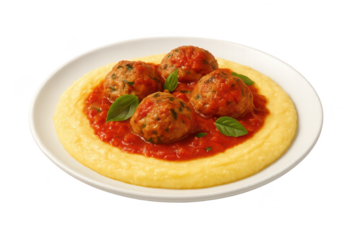 Delicious meatballs with polenta and tomato sauce isolated, transparent background
