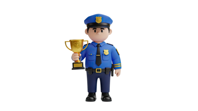 3D Cartoon Police Officer Holding a Gold Trophy on transparent background