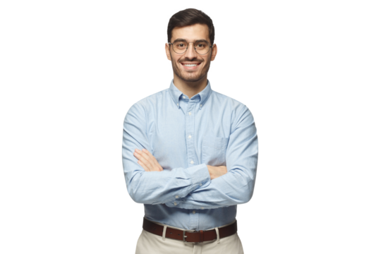 A cheerful businessman pointing and smiling, dressed in a suit against a white background.