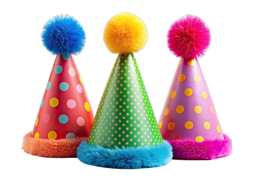 Three colorful cone party hats with fur pom poms in different colors and patterns - red, yellow, blue polka dots; green polka dots; purple polka dots - are lined up on a white background