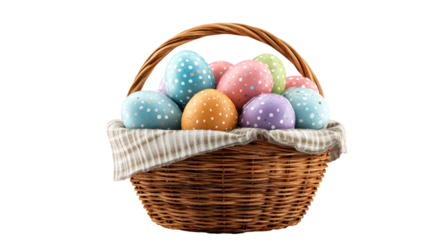 Festive colorful gift box with pink polka dots and blue stars, yellow ribbon bow, PNG image on transparent background