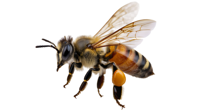 Closeup macro shot of a honey bee with pollen baskets full of yellow pollen, isolated on transparent background