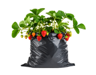 A close-up shot of a crumpled black plastic bag. The bag is positioned against a solid black background. The shape is uneven