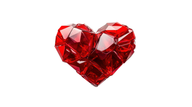 Red polygonal heart, 3D rendered, on black backdrop. Shiny facets create a textured, modern romantic symbol