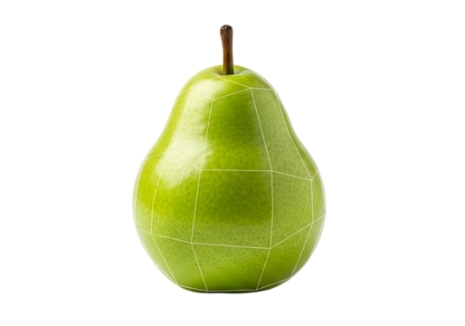 A vibrant lime-green pear, displayed against a stark black background, is highlighted by a polygonal mesh, showcasing its three-dimensional form.