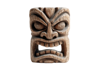Polynesian wooden tiki statue with carved face, isolated on a transparent background