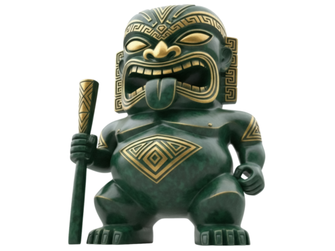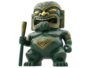 Isolated Maori Tiki statue of a green Polynesian god, carved with gold details on his face