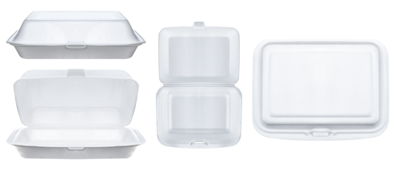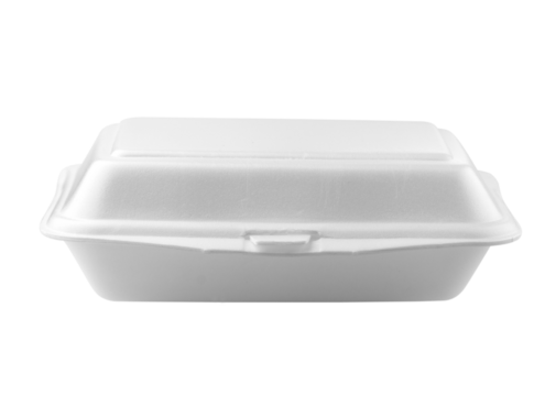Styrofoam lunch box or white foam clamshell food containers, open and closed. White styrofoam food box isolated. Lunch foam box