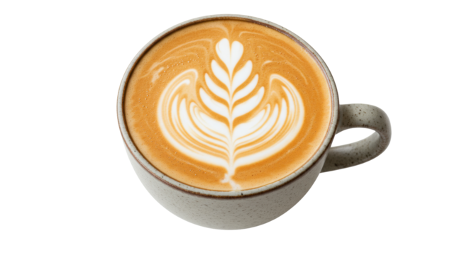 Latte art in a speckled mug isolated on a clean backdrop, coffee drink with a fern pattern for cafe menus
