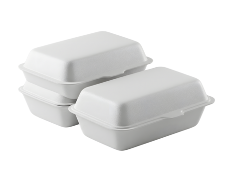 Three closed styrofoam takeaway boxes are stacked on a transparent background, ready for delivery or transport