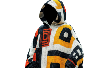 knitted poncho with tribal patterns in red, white, and black, soft texture, png.