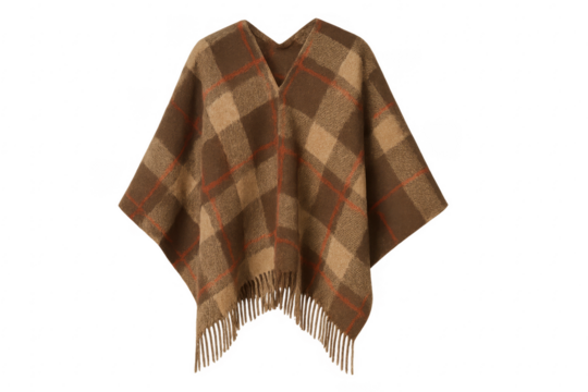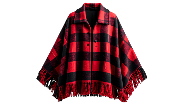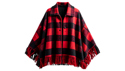Stylized red and black plaid poncho with fringe on dark background display fashionably isolated on solid white background