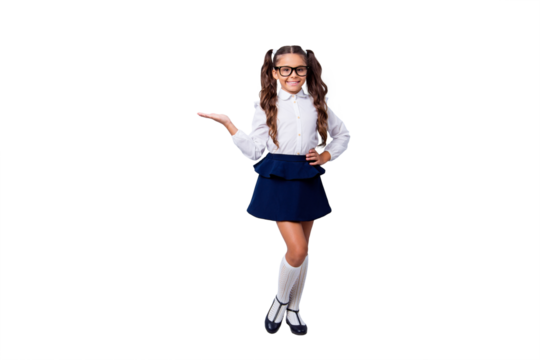 Smiling smart indian hispanic preteen girl with ponytails wearing school uniform standing isolated on transparent
