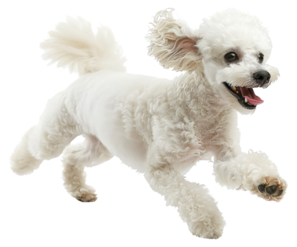 Adorable brown poodle puppy jumping isolated PNG, playful dog with curly fur on transparent background, cute pet for design and advertising