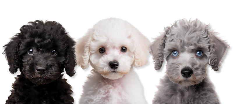 Three poodle puppies, different colors toy poodle puppies, transparent background
