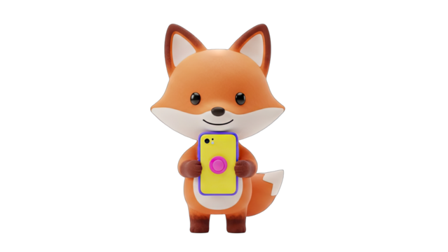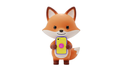 Adorable Orange Fox Cartoon Character Stands Holding a Yellow Smartphone with a Pink PopSocket Against a Transparent Background Digital Art