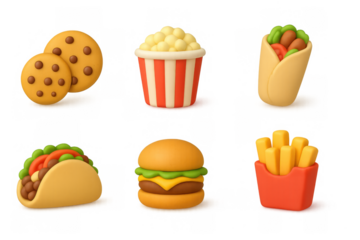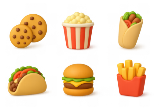 Colorful 3d style fast food icons featuring burgers, tacos, and more