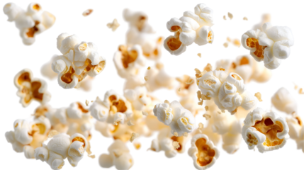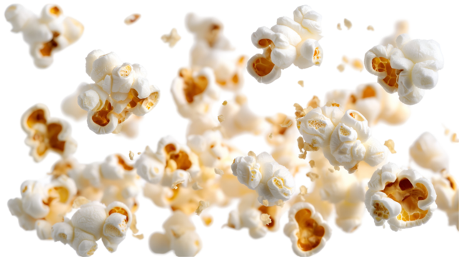 Close up Popcorn flying on a transparent background.