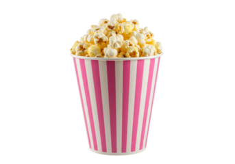 Popcorn in striped bucket isolated PNG, classic movie snack on transparent background, sweet and salty treat for cinema