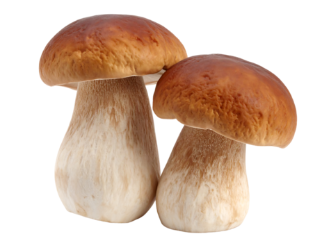 Two fresh porcini mushrooms with brown caps and creamy white stems on a white background.