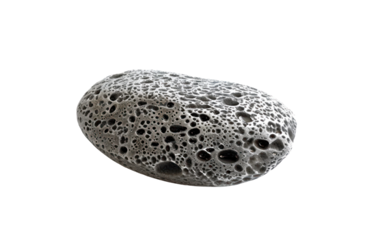 Close-up of a single, textured pumice stone against a white background, showcasing its porous surface. Ideal for natural skincare or geology themes.