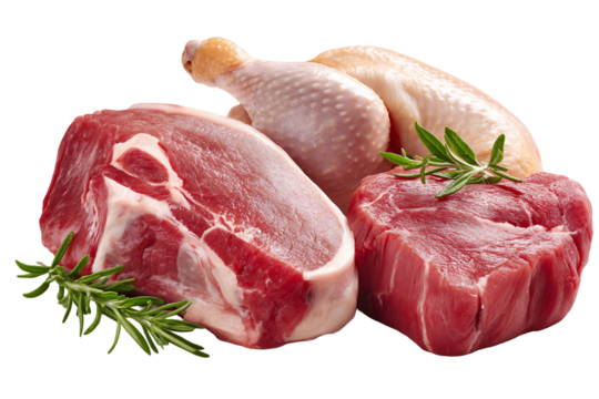 Raw Beef Tenderloin, Pork Chop, and Whole Chicken with Rosemary, PNG
