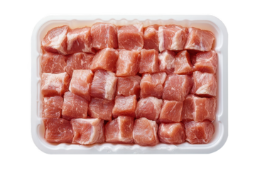 Fresh pork cubes arranged neatly in white tray, showcasing their pinkish hue and tender texture. Ideal for various culinary preparations