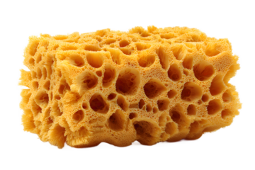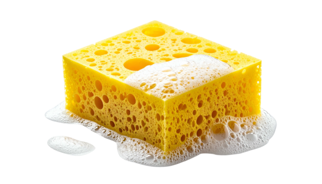 Yellow porous sponge isolated on transparent background, cleaning tool for household chores and dishwashing