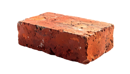 A close-up view presents a red-orange rectangular construction block. It appears rough and textured, with a porous surface. The brick rests on a transparent background
