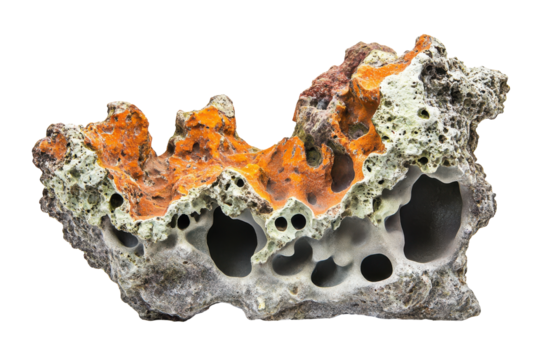Unique porous rock formation with orange and white textures isolated on transparent background. Heavy reef rock with unique texture and color variations isolated on white background.