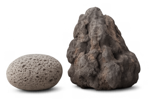 Volcanic rock formations displaying porous pumice stone and rugged lava rock, geology comparison on transparent background