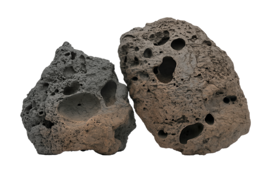 Two pieces of porous volcanic rock with a greyish-brown color and many visible holes, isolated on a white background.