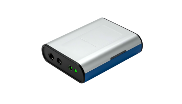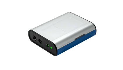 A small, rectangular electronic device with a silver top, blue sides, and ports on one end