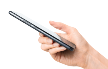 A woman's hand holds a smartphone on a white isolated background, side view