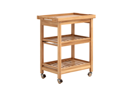 Rustic wooden kitchen island cart with wheels, butcher block table, mobile prep station, handmade furniture, wood texture, isolated on transparent background